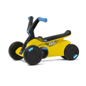 The well-known and award-winning BERG G02 is now available in 2 exciting and eye-catching colours. The GO2 SparX Yellow and the GO2 SparX Red. These bright colours are a great addition to the more subtle colours of Pink, Blue and Mint. The revolutionary GO2 is a unique combination of a push-car and a go-kart, in one. In the first phase, the GO2 is a well-designed push-car. Wide at the front for extra stability and narrow at the back so that the child can learn to scoot easily. In the first phase, the child learns how to sit, steer and scoot. In the second phase, the GO2 becomes a go-kart. Fold out the pedals and the child will learn to pedal. To ensure that the transition from scooting to pedalling is as easy as possible, the child's legs easily fit alongside the pedals, even when they are folded out. The long, textured saddle does not have to be adjusted; the GO2 simply grows with the child. Details such as the soft handles and whisper tyres add the finishing touches to the GO2.